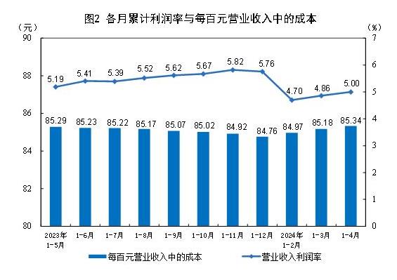 1—4月份,规模以上工业企业每百元营业收入中的成本为85.34元,同比增加0.14元;每百元营业收入中的费用为8.42元,同比减少0.02元。