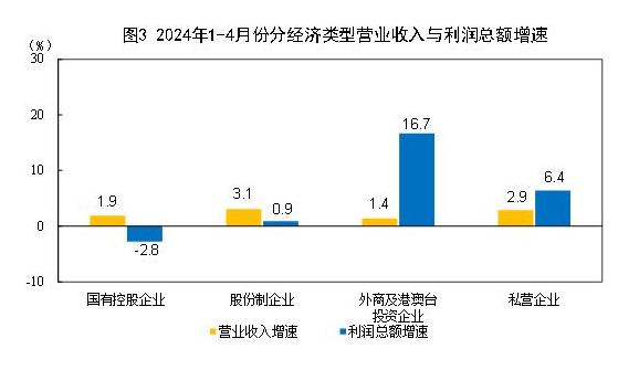 1—4月份,规模以上工业企业中,国有控股企业实现利润总额7396.4亿元,同比下降2.8%;股份制企业实现利润总额15508.1亿元,增长0.9%;外商及港澳台投资企业实现利润总额5285.9亿元,增长16.7%;私营企业实现利润总额5448.0亿元,增长6.4%。