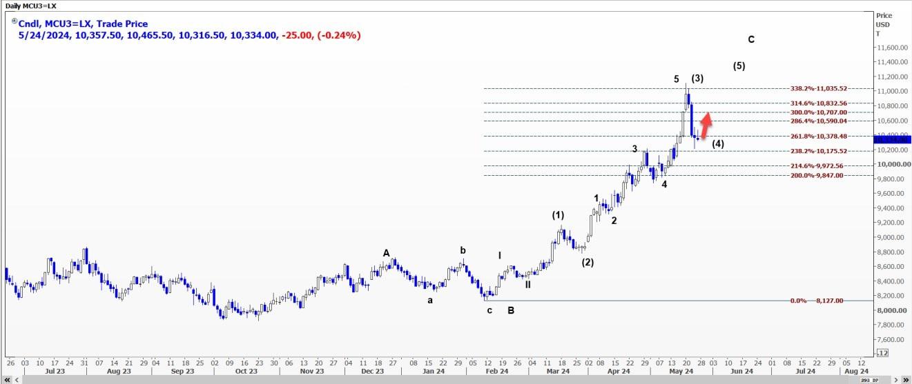 尽管如此,知名机构的分析师预计,铜价在本周可能会测试每公吨10,590美元的阻力位,并有可能进一步上升至10,707-10,833美元区间。这一预测基于对市场波浪形态的分析,显示出铜价的上行潜力。