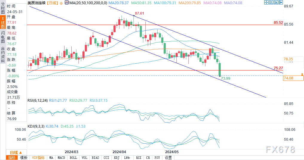 周二(6月4日)北京时间04:38,WTI原油报74.08美元/桶,跌幅3.78%。原油价格跌至2月份以来的最低水平。