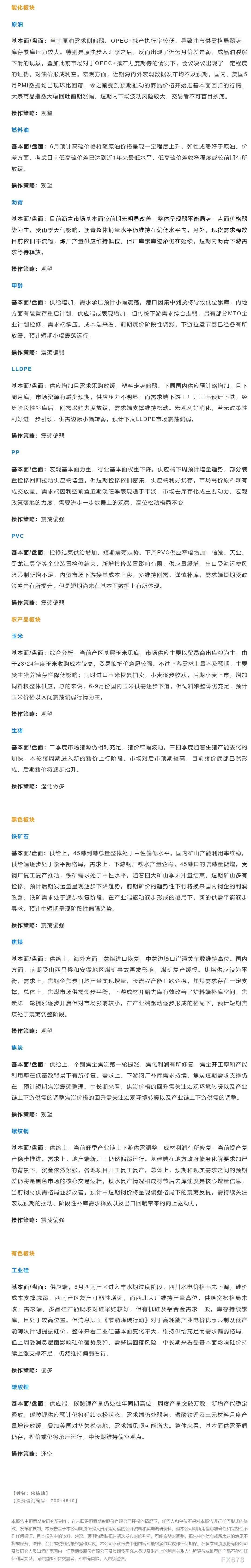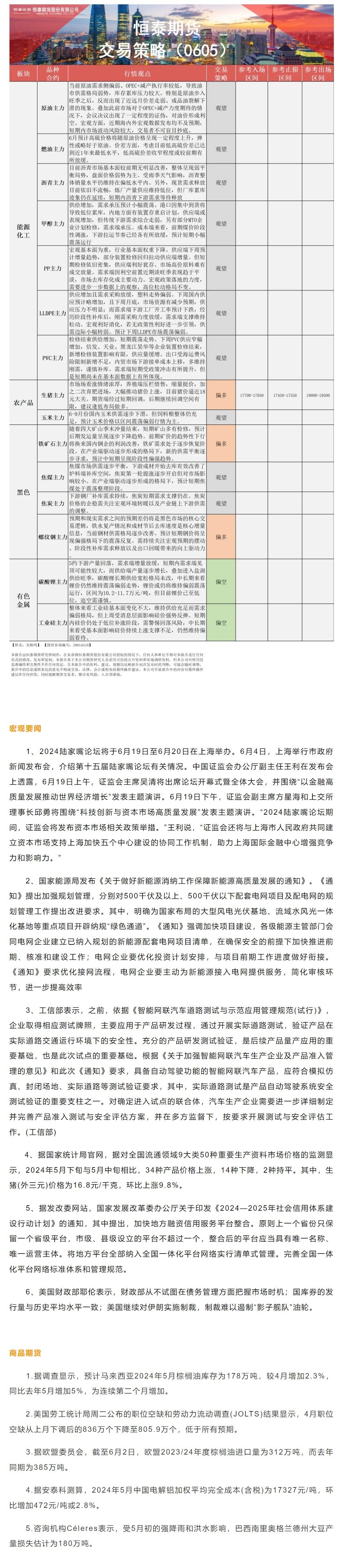 以下是恒泰期货今日早间交易策略,覆盖品种有:宏观分析、原油燃料油等能源化工、玉米生猪等农产品、黑色系如铁矿石焦煤焦炭螺纹钢、有色系如工业硅碳酸锂等。