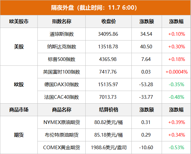 美股:纳指日线七连涨,道指、标普500指数日线六连涨。截止收盘,道琼斯指数上涨34.54点,收于34095.86点,涨幅为0.10%;纳斯达克指数上涨40.50点,收于13518.78点,涨幅为0.30%;标普500指数上涨7.64点,收于4365.98点,涨幅为0.18%。