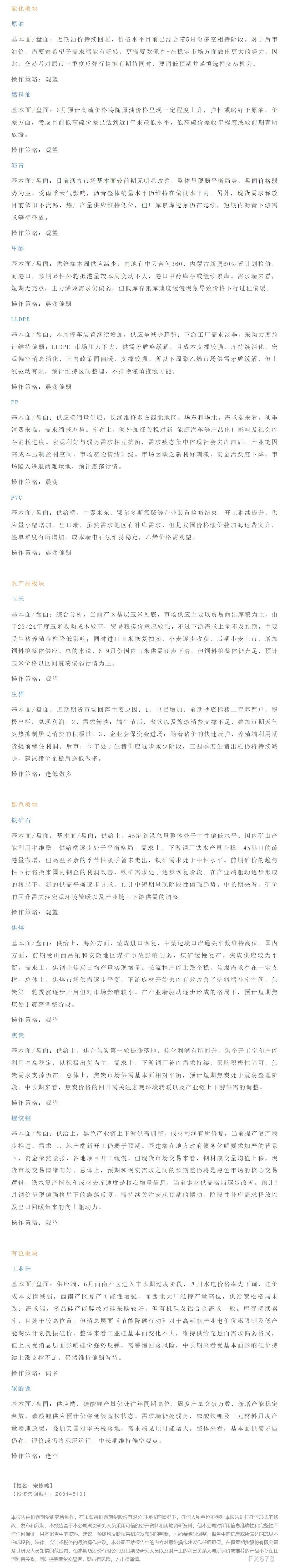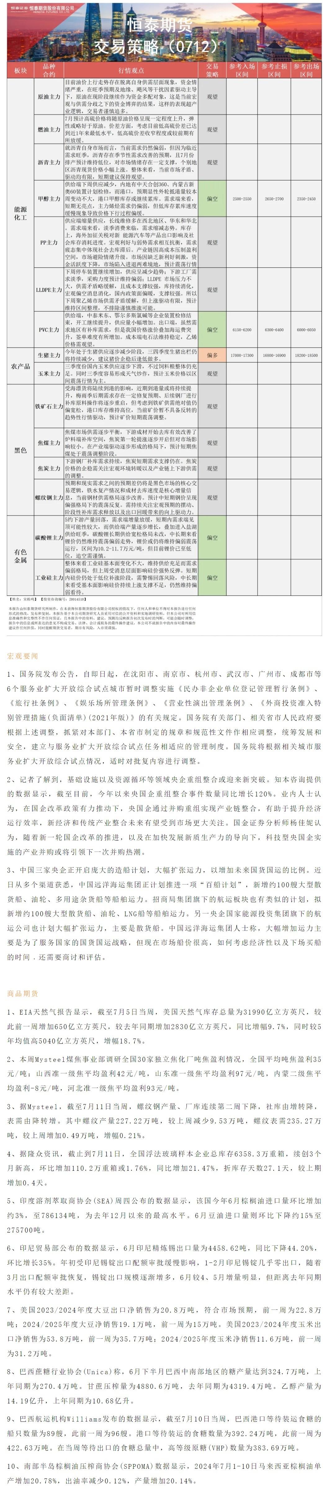以下是恒泰期货今日早间交易策略,覆盖品种有:宏观分析、原油燃料油等能源化工、玉米生猪等农产品、黑色系如铁矿石焦煤焦炭螺纹钢、有色系如工业硅碳酸锂等。