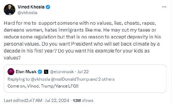 马斯克在X上向科斯拉发出邀请:“来吧,维诺德。特朗普/万斯 让我们一起出发(LFG)!!!”