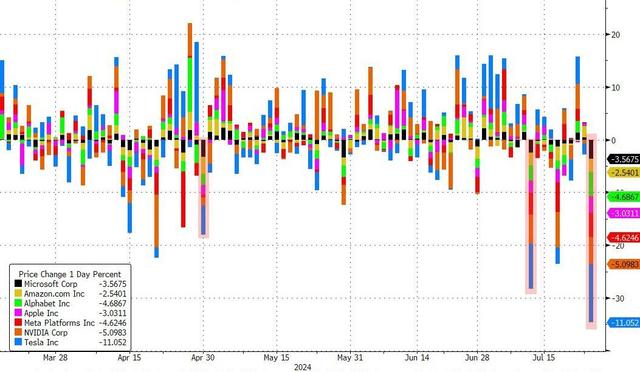 特斯拉暴跌12%,谷歌跌超5%,美股“七姐妹”全军覆没,下跌了5.9%,自5月以来首次跌破50日均线。整体市值蒸发7680亿美元,创下自2012年Meta上市来的最大单日市值损失纪录。