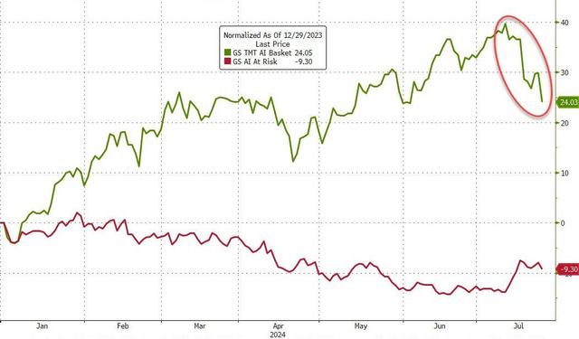 近期表现亮眼的小盘股也“熄火”,小盘股指隔夜跌2.1%。随着科技股遭受打击,投资将资金转向中小型公司,罗素2000指数在过去11个交易日跑赢标普500 10.9个百分点,创下24年多来最大优势。许多分析师认为中小型公司可能是降息的受益者之一。