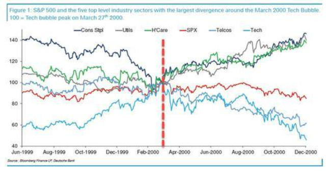 Reid通过图表展示了2000年3月科技泡沫破裂之前的景象:消费必需品、医疗保健和公用事业等防御性行业大幅下跌,科技股则吸引了大量资金。而当泡沫破裂时,资金迅速回流,导致防御性行业的股价在年底较3月泡沫破裂时上涨了35-45%。