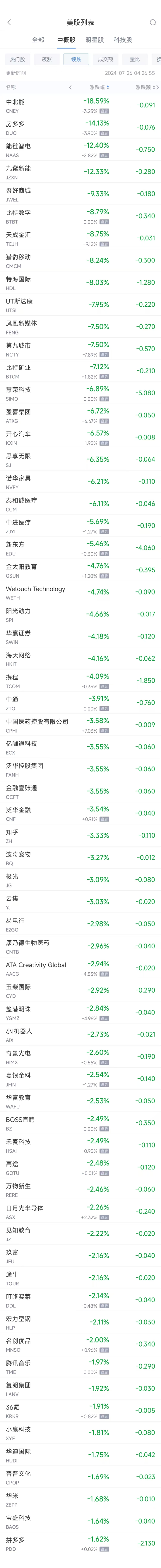 领跌中概股列表: