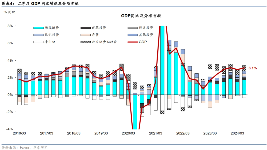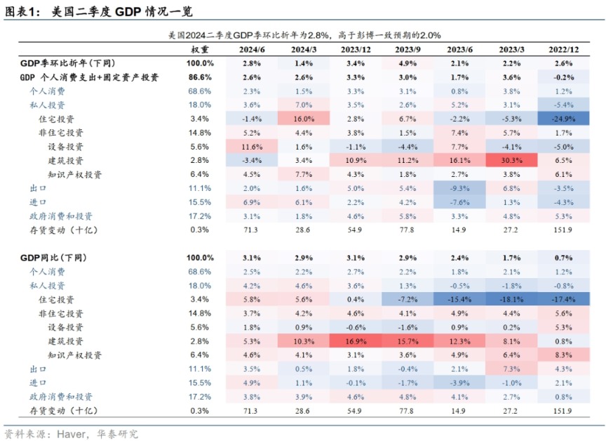 华泰证券研报指出,二季度美国GDP数据显示美国经济仍有支撑,但相对2023年下半年有所放缓,往前看,预计下半年美国增长动能边际降温,增速位于趋势水平附近——总体而言,2季度GDP虽然超预期,但应该不对9月降息造成制约。2024年上半年美国GDP环比折年增速平均为2.1%,仍然位于潜在增速附近,缓解了近期对美国衰退风险上升的担忧。但是,与去年下半年均值(4.1%)相比,美国经济动能仍延续减速趋势。往前看,考虑到就业市场放缓以及财政支撑力度边际下降,我们维持今年下半年美国增长边际降温,增速降至趋势水平附近的判断。此外,尽管增长仍有韧性,但考虑到就业指标仍在放缓,且5-6月通胀回落至低位,预计联储仍有望在9月开启降息周期。