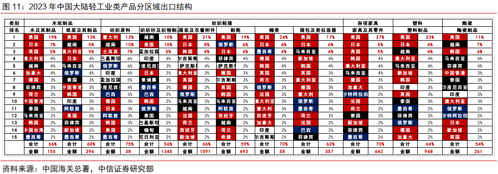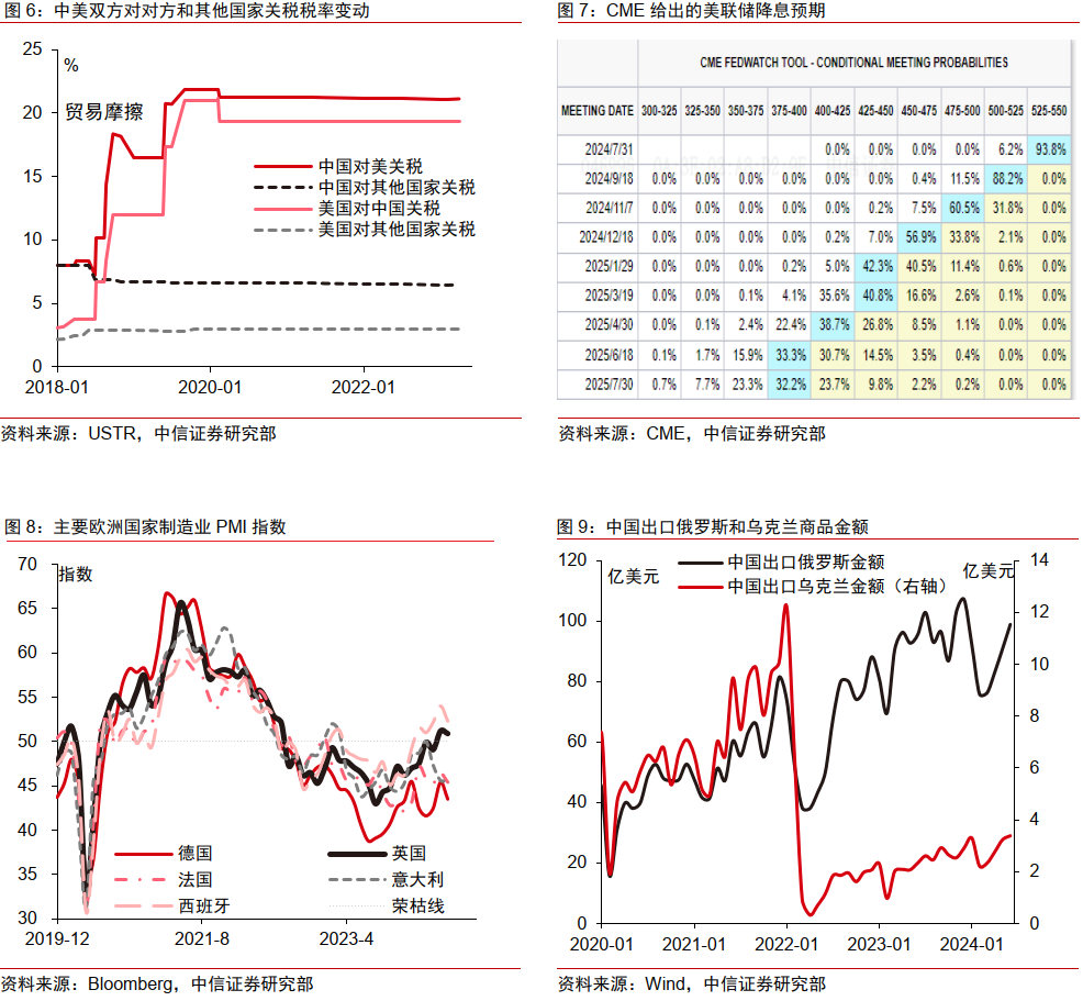 经贸关系方面,警惕中美关税摩擦风险:特朗普在中美经贸关系方面重点关注(美对华)贸易逆差、(中资对美)投资强监管以及非美尖端企业制裁等方面。特朗普近期在竞选中强调“取消中国最惠国待遇”、“将对中国的关税提高至60%,并对所有商品征收额外的10%的常规关税”,我们认为不排除对华贸易政策或超预期的可能[9]。若美方取消中国最惠国待遇,基准情形下,若不叠加其他关税政策,将中国进口产品平均税率从19%增加到32%(图6),简单线性外推计算,我国对美出口增速受影响程度或在8-10%,全体出口增速受影响程度或在2-3%;悲观假设下,若美方叠加其他关税,对中国进口商品所征关税全面提高至60%,简单线性外推计算,我国对美出口增速受影响程度或在20-30%,全体出口增速受影响程度或为4-6%;分行业结构来看,我国电子设备、通用机械设备、通信设备以及家具等轻工业所受影响或较大,出口链尤其出口美国或面临巨大压力。