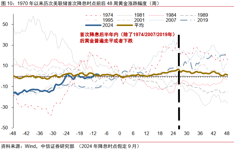 贵金属方面,对于黄金价格应当重点关注降息预期博弈,首次降息落地后黄金价格或难呈现上涨趋势。自上半年通胀黏性叠加地缘政治扰动影响下黄金呈现情绪面超涨现象之后[7],当前仍处于回归基本面的早期阶段,若俄乌冲突结束,预计对资产价格的影响有限。7月中旬市场激烈博弈降息预期(图7),黄金价格进一步冲出新高。结合我们模型测算和对美联储货币政策的判断,当前黄金已经充分计入了降息预期,黄金价格或呈震荡行情,降息预期博弈对黄金价格走势或呈向下的风险敞口。结合过往历史数据分析,除1974/2007/2019年外,美联储首次降息落地后,黄金价格多数呈现震荡回落走势(图10)。