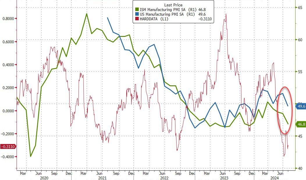 先来看制造业数据。周四公布的数据显示,美国供应管理协会(ISM)制造业指数下滑1.7至46.8,为2023年11月以来的最低水平(已接近于新冠疫情封锁后的最低水平)。