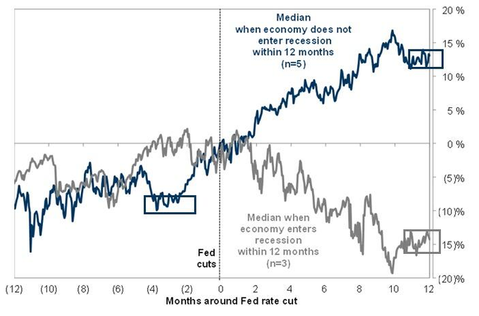 如上图所示,如果经济没有陷入经济衰退,标普500指数在首度降息接下来的一年里平均能上涨约12.5%。而如果经济不幸陷入衰退,标普500指数则平均会下跌13%左右——两者之间的差异实在是太大了。
