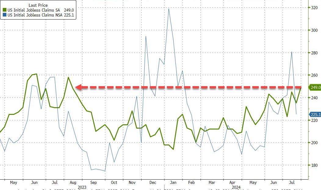 根据劳工部周四发布的数据,截至7月27日当周,首次申领失业救济人数增加14,000人,至249,000人。接受彭博调查的经济学家中值预测中值为236,000人。密西根州和密苏里州增幅较大。截至7月20日当周,持续申领失业救济人数也升至188万,为2021年11月以来最高。