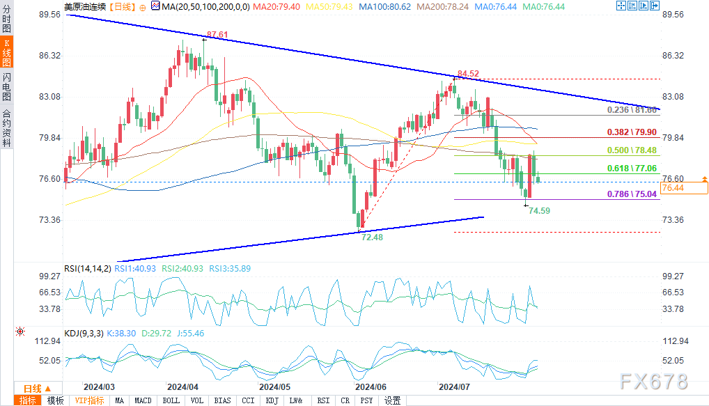 WTI原油期货上涨,从之前的下跌中反弹,支撑位在75.77美元,阻力位在77.96美元。在全球需求疲软和中东紧张局势的推动下,油价上涨,但面临第四周下跌。