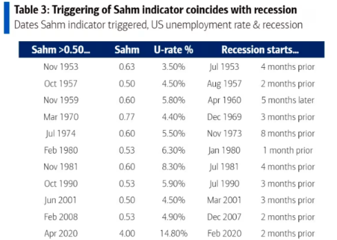 “萨姆规则”是指当美国失业率的3个月移动平均值相对于过去12个月的最低点上升超过0.5个百分点时,经济衰退就可能开始。这一规则自1970年代以来的准确率为100%。而且不同于收益率曲线倒挂等其他经济衰退预警指标,从触发“萨姆规则”到美国经济真的步入衰退之间的间隔有时会很短——例如近六次触发“萨姆规则”到经济衰退之间,最短的只有1个月,最长的也只有4个月。