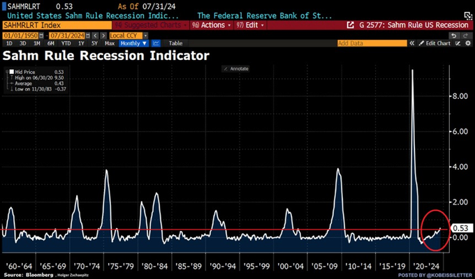 美国劳工部报告称,7月份美国雇主仅创造了11.4万个就业岗位,远低于经济学家的预测,失业率也意外上升至了4.3%,一举触发了基于失业率指标预测衰退的“萨姆规则”。
