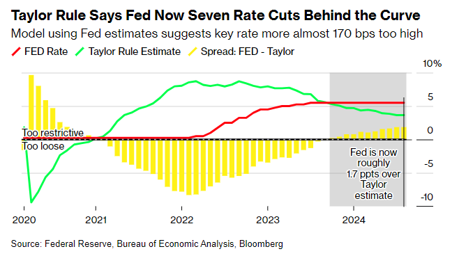 颇有意思的一项对比是,经典的“泰勒法则”模型表明,当前美联储的基准利率比合理水平高约1.7个百分点——这相当于当前的美联储在降息方面可谓慢了“七拍”,其本应降息七次,每次25基点。