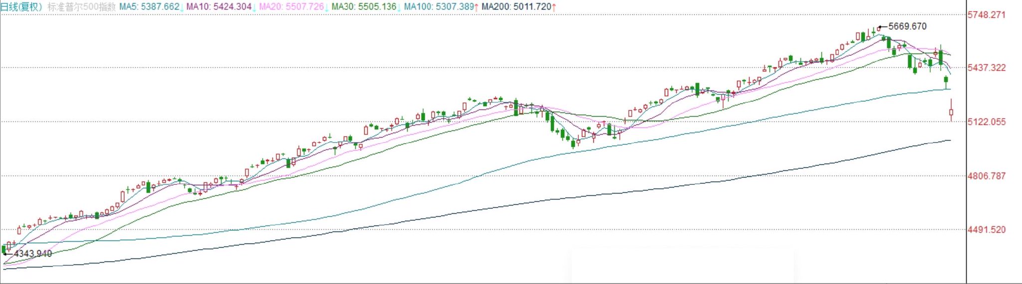由于标普500指数周一盘中一度跌至5119.26点的低点,他预计,在超卖状况下,标普500将短暂反弹至100日移动均线(图中浅蓝)所在的5300点左右。但该指数可能在未来几周恢复跌势,接近长期200日移动均线(图中深蓝)所在的5000点左右。