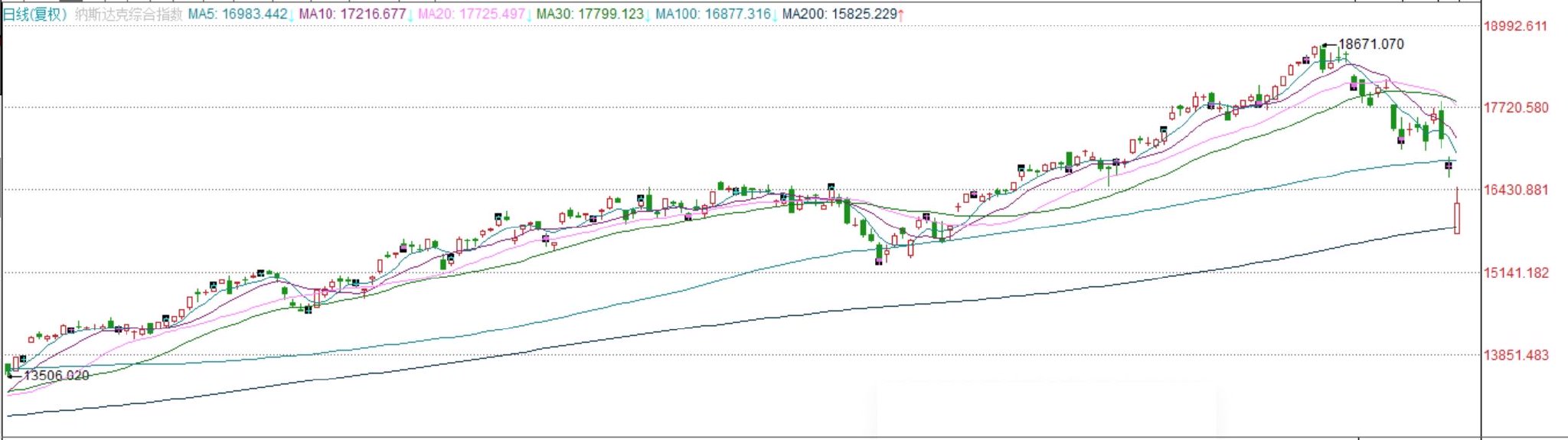 美东时间周一,纳斯达克100指数一度跌破200日移动均线17657点,这是该指数自2023年3月以来首次跌破这一水平。纳指收于17895点,正位于200日均线(图中深蓝)附近。