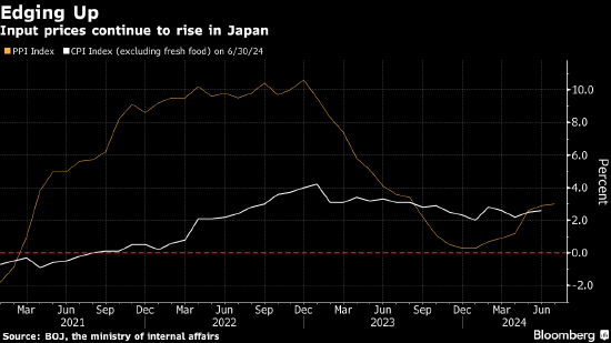 日本央行周二公布的数据显示,衡量日本企业投入价格的指标同比上涨3.0%;经济学家预期为3.1%。当月PPI环比上涨0.3%,符合普遍预期。
