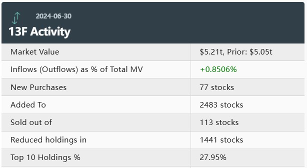 统计数据显示,先锋集团第二季度持仓总市值达5.21万亿美元,上一季度总市值为5.05万亿美元。先锋集团在第二季度的持仓组合中新增了77只个股,增持了2483只个股。同时,先锋集团减持了1441只个股,清仓了113只个股。其中,先锋集团的前十大持仓标的占总市值的27.95%。
