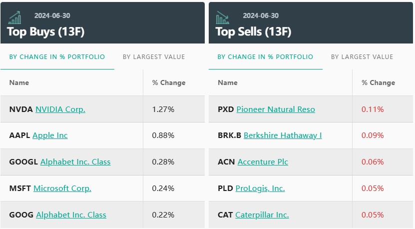 前五大卖出标的分别是:先锋自然资源(PXD.US)、伯克希尔哈撒韦、埃森哲(ACN.US)、安博(PLD.US)、卡特彼勒(CAT.US)。