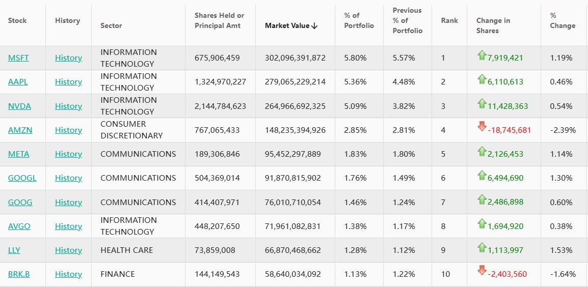 在前五大重仓股中,微软(MSFT.US)位列第一,持仓约6.76亿股,持仓市值约为3021亿美元,占投资组合比例为5.80%,较上季度的持仓数量增加1.19%。