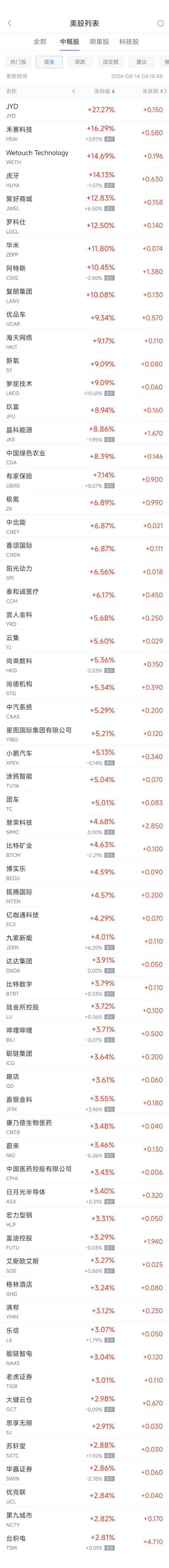 上涨股当中(按市值降序排列),台积电涨2.83%,拼多多涨1.09%,阿里巴巴涨0.26%,京东涨0.23%,百度涨1.14%,携程涨0.24%,联电涨2.53%,日月光半导体涨3.61%,中通涨0.76%,富途控股涨3.29%,蔚来涨3.32%,满帮涨3.12%,BOSS直聘涨1.14%,小鹏汽车涨5.35%,哔哩哔哩涨3.71%,极氪涨6.93%,360数科涨2.03%。