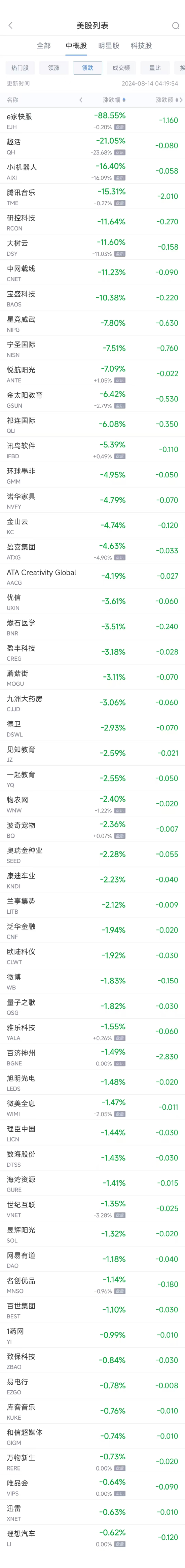 下跌股当中(按市值降序排列),网易跌0.09%,中华电信跌0.08%,腾讯音乐跌15.31%,理想汽车跌0.62%,百济神州跌1.49%,贝壳跌0.27%,新东方跌0.37%,华住酒店集团跌0.10%,唯品会跌0.68%,WSP控股跌0.02%,名创优品跌1.14%。