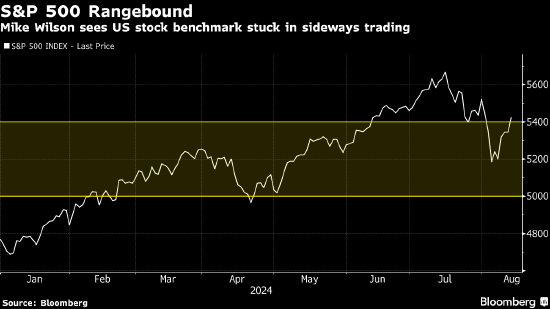 Wilson在7月准确预测了股市近期的下行。他说,由于交易员在上周的大跌后仍心有余悸,因此不太可能出现大的崩盘。这种观点与近年来令Wilson声名鹊起的大胆看跌观点形成了鲜明对比。不过,他仍然认为标普500指数几乎没有上涨空间,预计该基准指数将在5,000-5,400点区间波动,这个区间的下限意味着股市从周二水平下跌大约7%,上限则基本与当前水平持平。