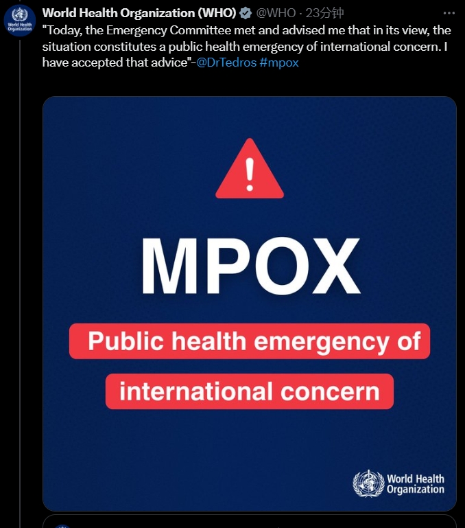 上周,谭德塞依据《国际卫生条例》召集了一个突发事件委员会,来评估非洲猴痘疫情激增的情况。该委员会周三给出建议,目前的情况已经构成“国际关注的突发公共卫生事件”。谭德塞采纳该建议,并举行全球记者会发出警告。