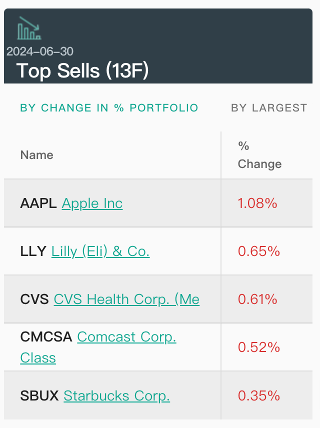 减持股票方面,桥水减仓的前五大标的分别为苹果,礼来、西维斯健康(CVS)、康卡斯特和星巴克。其中,苹果持仓从184万股减少逾七成至46.9万股,礼来持仓从28万股减至9.6万股。