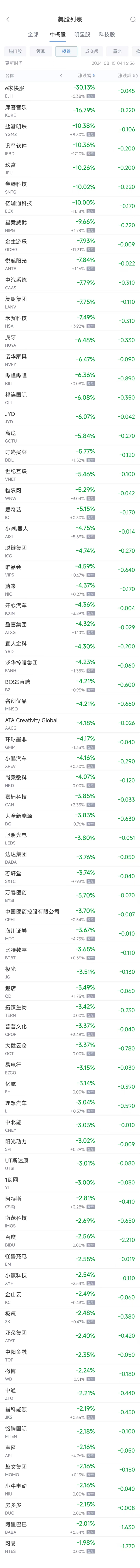 领跌中概股列表: