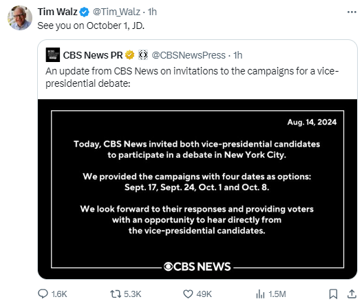 美国民主党副总统候选人蒂姆·沃尔兹在社交媒体平台X上转发CBS News邀请两党副总统候选人辩论的帖子,写道“10月1日见,JD。”