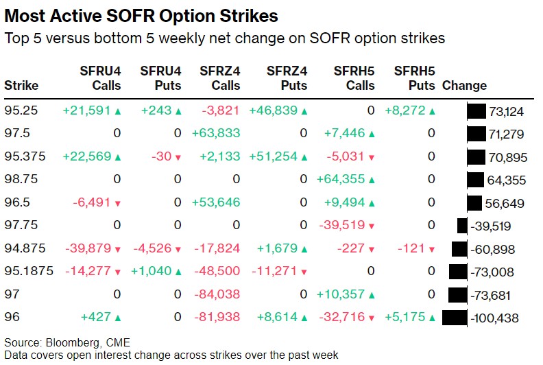 最活跃的SOFR期权行使价——SOFR期权行使价每周净变化前5名与后5名的对比