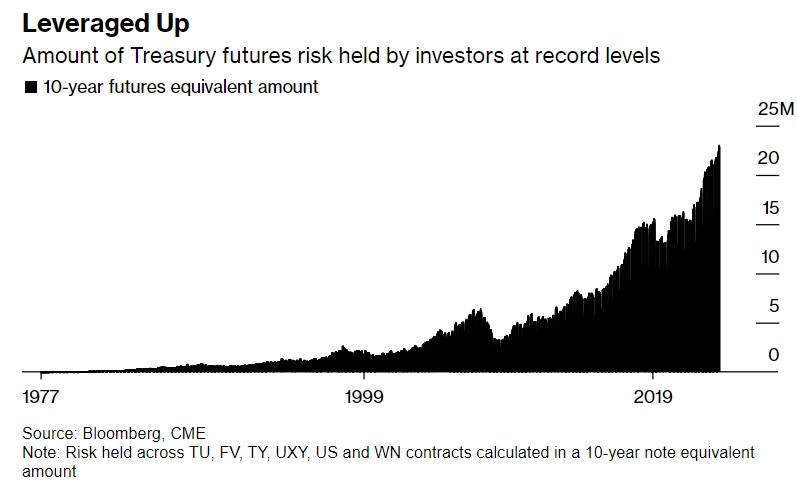 芝加哥商业交易所集团(CME Group Inc.)的数据和Bloomberg分析数据显示,在上周,期货市场未平仓合约,即可以选择做多或做空方向的交易者所承担的整体风险规模,达到了创纪录的近2300万张10年期美国国债期货合约。基础现金票据每变动一个基点,风险约为15亿美元。