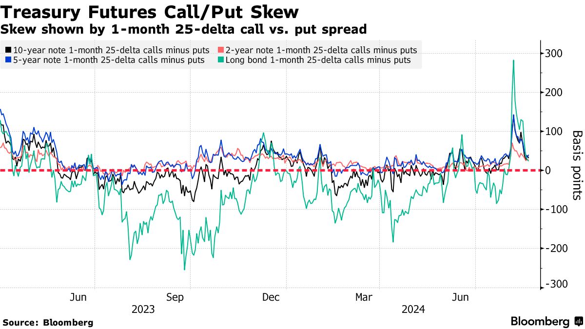 在几周前因交易员寻求美国国债市场持续反弹而出现看涨溢价后,为对冲市场波动所支付的溢价继续回落至中性水平。周二国债期权流动包括通过十月期权的套杀买方所进行的高达 500 万美元溢价长期期权波动押注,该期权将于 9 月 18 日美联储货币政策公告后两天到期。上周后半段,围绕9月和10月的10年期国债看跌期权出现大量交易流资金,表明有一部分交易者瞄准了更高的10年期美国国债收益率。