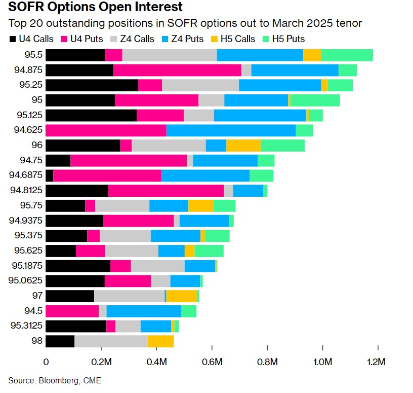 从SOFR期权持仓数据统计来看,SOFR期权市场似乎已经从对美联储可能采取的50个基点降息的押注全面转向25个基点的调整。95.50点位的看涨期权和看跌期权的分布显示,市场对未来美联储基准利率可能维持在较低水平的预期在近日大幅增强。