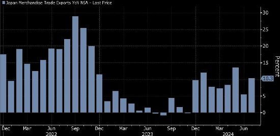 7月出口受到了日元疲软提振。财务省表示,当月日元兑美元均值为159.77,比一年前低12.3%。