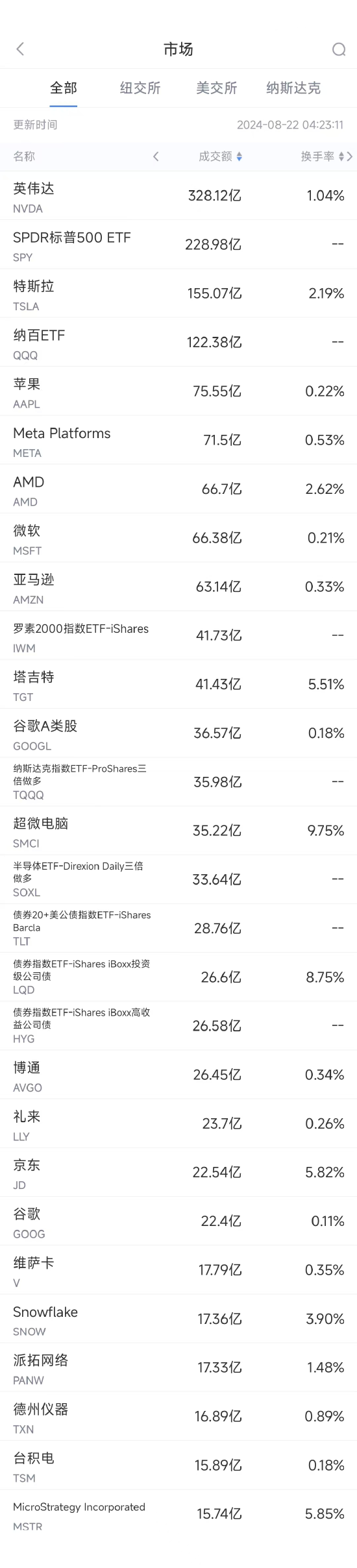 第20名MicroStrategy收高5.78%,成交15.74亿美元。