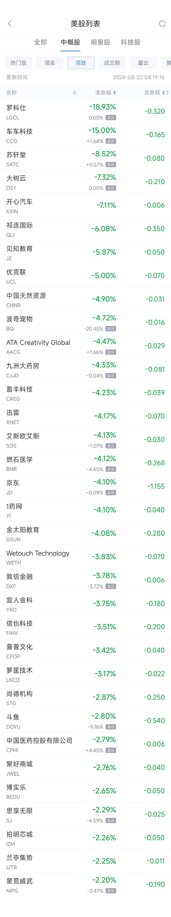 领跌中概股列表: