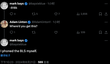 然而在此之前,已经有网友在社交媒体上发布了这个数据。在晚上22点15分左右,这名网友爆料称下修数字为81.8万,并且公开表示自己刚刚和美国劳工统计局打过电话。很快,官方公布的数据证实了他的爆料。