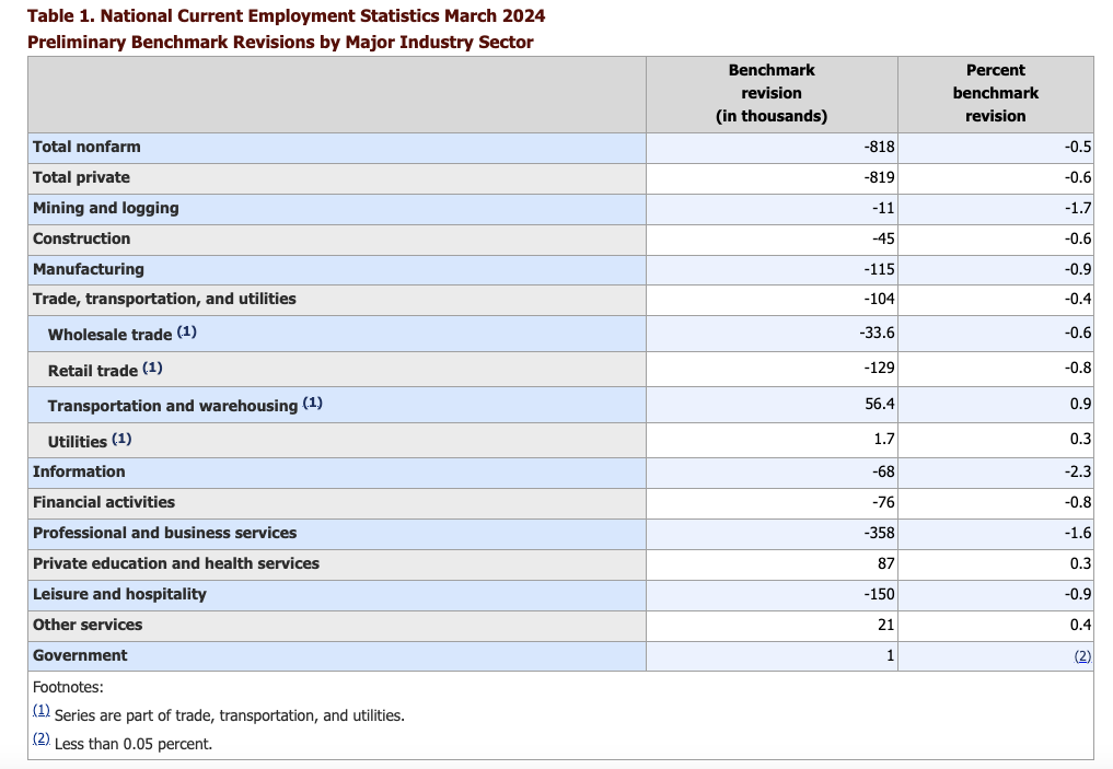 经过一段令人瞠目结舌的混乱后,美国劳工统计局周三宣布,在截至2024年3月的12个月内,非农就业数据初步下修81.8万人。这个数字大致在事前经济学家分析的范围内。