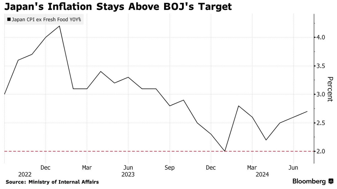 核心CPI已经连续28个月保持在或高于日本央行2%的目标。7月31日,日本央行将基准利率上调至0.25%,并表示实际利率仍为负值,显示出进一步加息的空间。