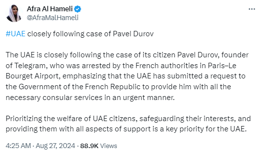 阿联酋向法国官员提出要探访被拘留的Telegram创始人帕维尔·杜罗夫,他是这个海湾国家的公民。