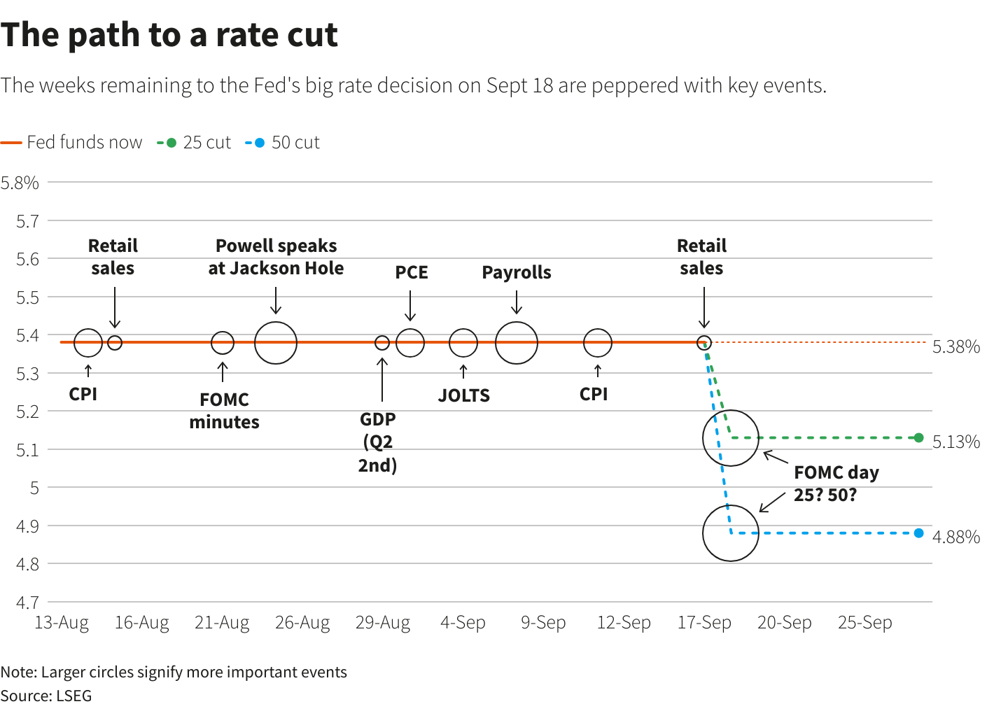 更多的经济疲软迹象可能再次震荡股市,并使下月降息幅度的天平向50个基点的预期发生转变。