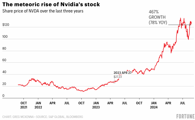 在人工智能“军备竞赛”中,英伟达的股价一直在上涨,其人工智能芯片仍然是同类中最好的,而且很难获得。与此同时,人们担心科技公司跟人工智能相关的巨额资本支出可能需要很长时间才能获得回报。比如,谷歌等一些科技巨头就表示,人工智能不太可能很快出现重大回报。