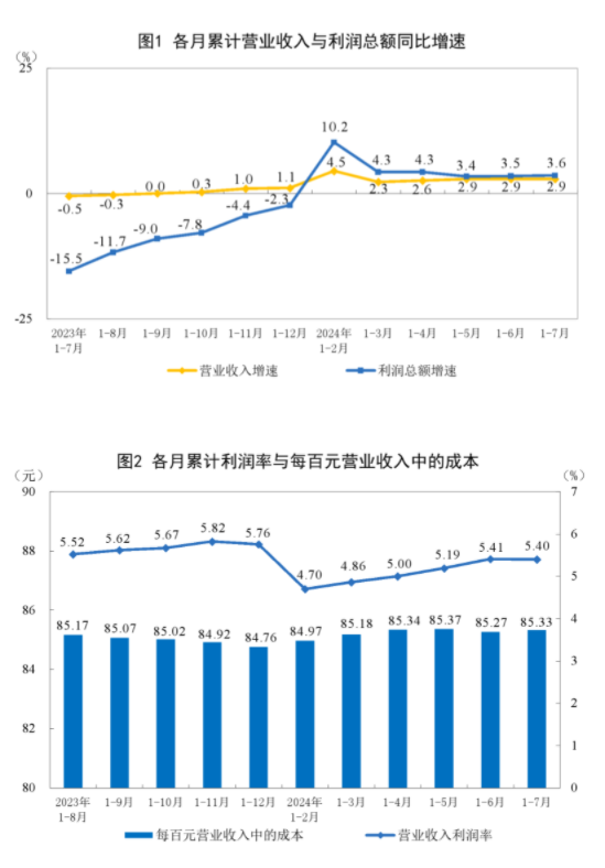 工业企业营收平稳增长。随着市场需求稳定恢复,产销衔接水平有所改善,工业企业营收平稳增长。1—7月份,规上工业企业营业收入同比增长2.9%,增速与1—6月份持平。企业营收稳定增长,为利润持续恢复创造有利条件。