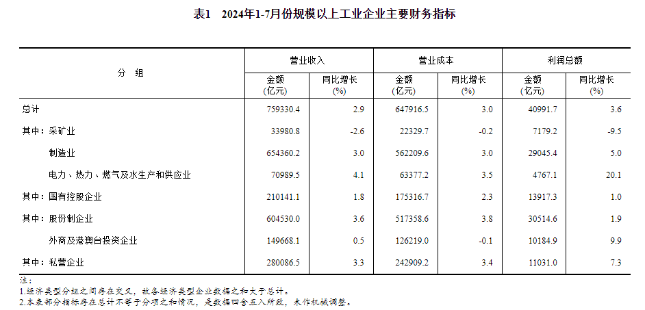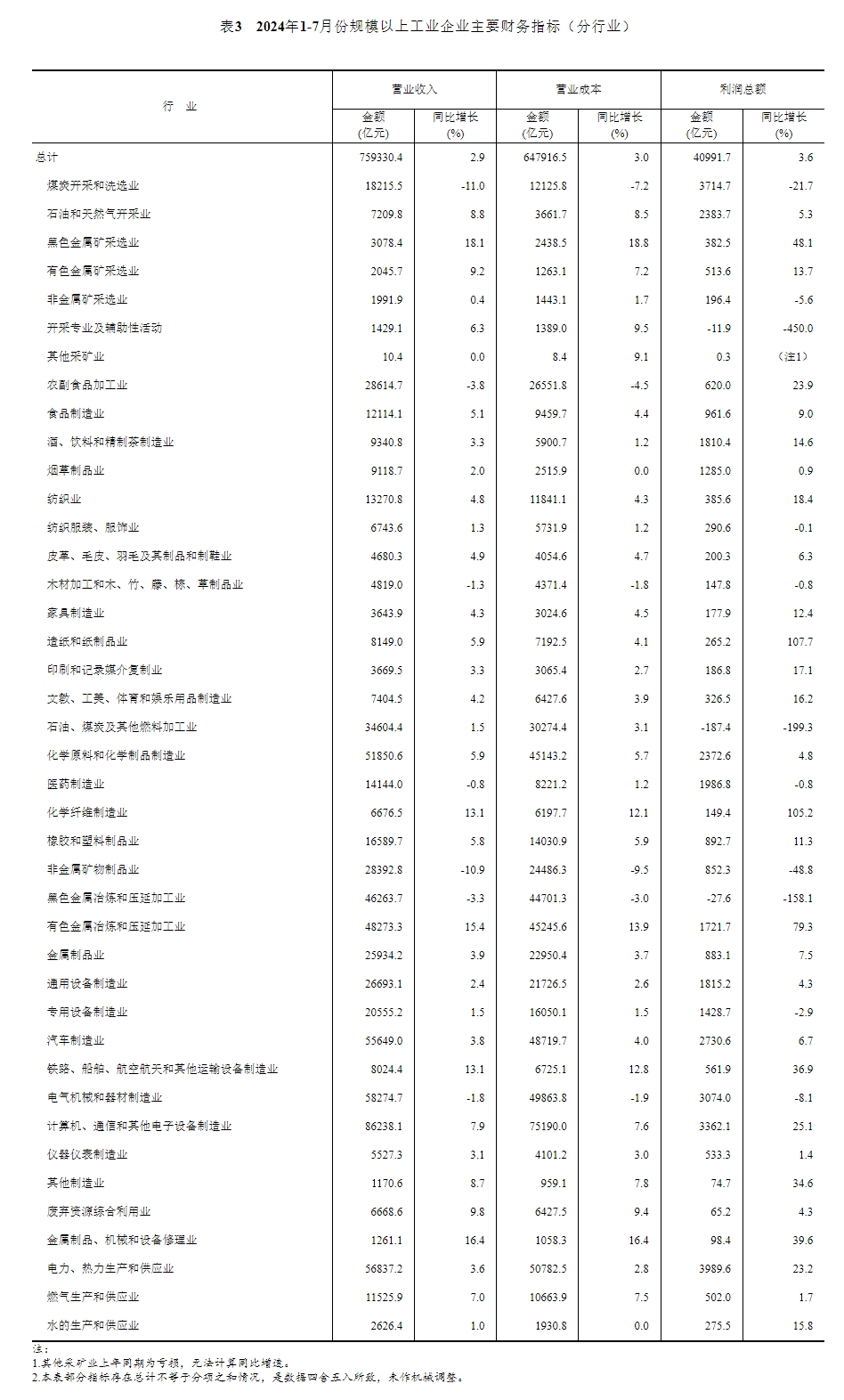 1—7月份,全国规模以上工业企业实现利润总额40991.7亿元,同比增长3.6%(按可比口径计算,详见附注二)。